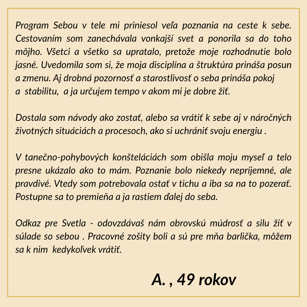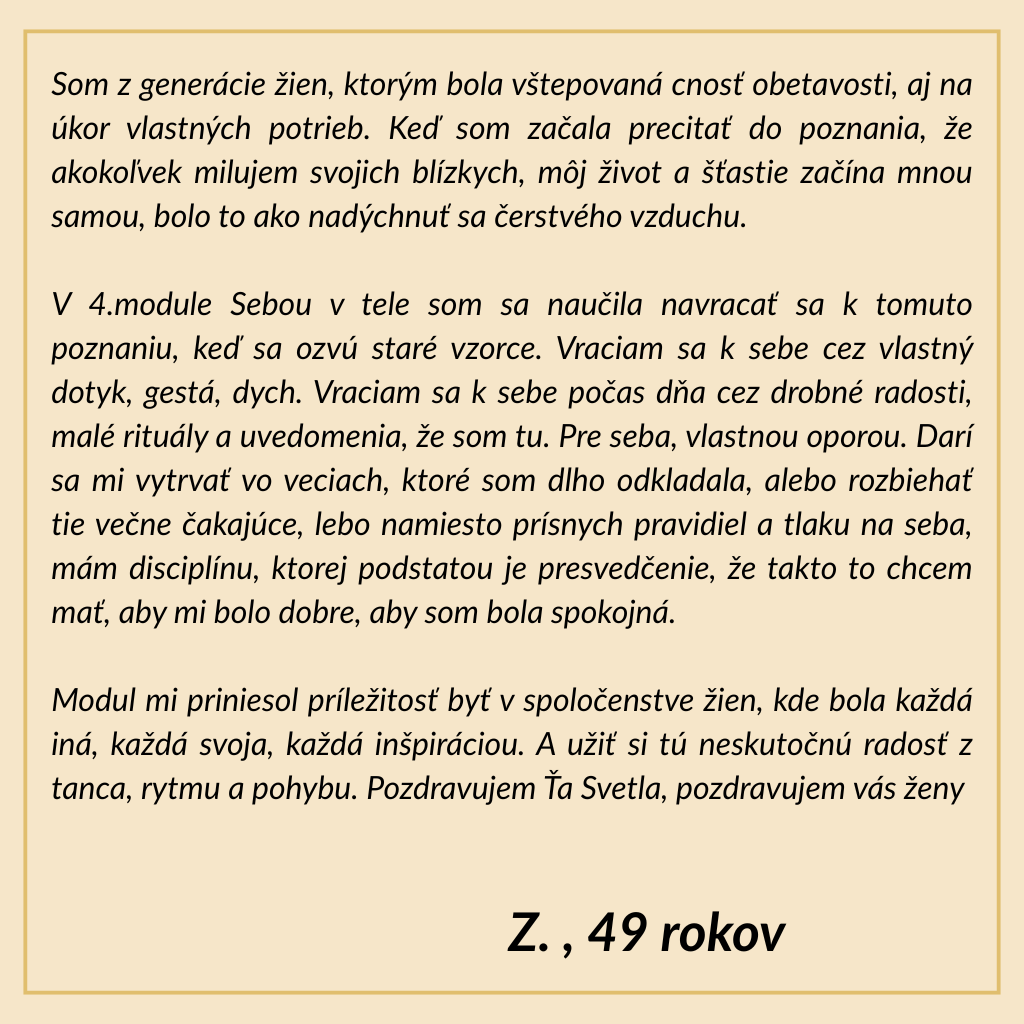 Kúpou tohto modulu si rezervujete miesto v tanečnej skupine. Čaká nás 12 celodenných workshopov a 12 ONLINE tréningov a ďalšej podpory. Workshopy prebiehajú formou pravidelných stretnutí 1x do mesiaca v určený sobotu (z toho 3 nedele - viď. termíny) Modul môžu absolvovať tanečnice, ktoré ukončili tanečný modul č. 3 Dušou v tele. PLATBA: Platbu môžete uhradiť v plnej výške alebo je možné rozdeliť ju na 5 časti. Zaplatíte zálohu v hodnote 150€ a zvyšné sumy zaplatíte podľa určených splátok po dohode s lektorom najneskôr do septembra 2026. Storno podmienky: 50% storno 3 dni pred začiatkom kurzu, v prípade náhradníčky 0% storno počas kurzu 100% storno ( závažné dôvody sú riešené individuálne) VIAC O MODULE TU ! Rozpis termínov: 14.marec 2026 18. apríl 2026 10. máj 2026 (nedeľa) 13. jún 2026 5. júl 2026 (nedeľa) 29. august 2026 26. september 2026 24. október 2026 21. november 2026 20. december 2026 (nedeľa) 23.január 2027 20. február 2027 V rámci skupiny je úprava termínov a dohoda možná. V cene máš: vedenú celodennú tanečno-pohybovú prax v počte 70 tanečných dielní 12x online tréning 12x rutinky bezpečný rámec a prácu v malej skupine obed + občerstvenie podporné materiál: playlist, newsletter, pracovný list Čo si zoberieš do bežného života: pevnejšie hranice (bez tvrdosti) schopnosť nepodliehať toxicite (vlastnej aj cudzej) návrat do tela ako "domov", keď ťa niečo vyhodí z rovnováh V tomto module pracujeme cez: tanečno-pohybovú prax (dynamika + kontemplácia) reguláciu nervového systému (aby telo vedelo zostať v bezpečí) rozlišovanie: kedy som v autopilotovi a kedy v stabilite vedomú prácu s hranicami, toxicitou a návratom k sebe integráciu: aby sa z workshopu nestal "pekný zážitok", ale zručnosť do života