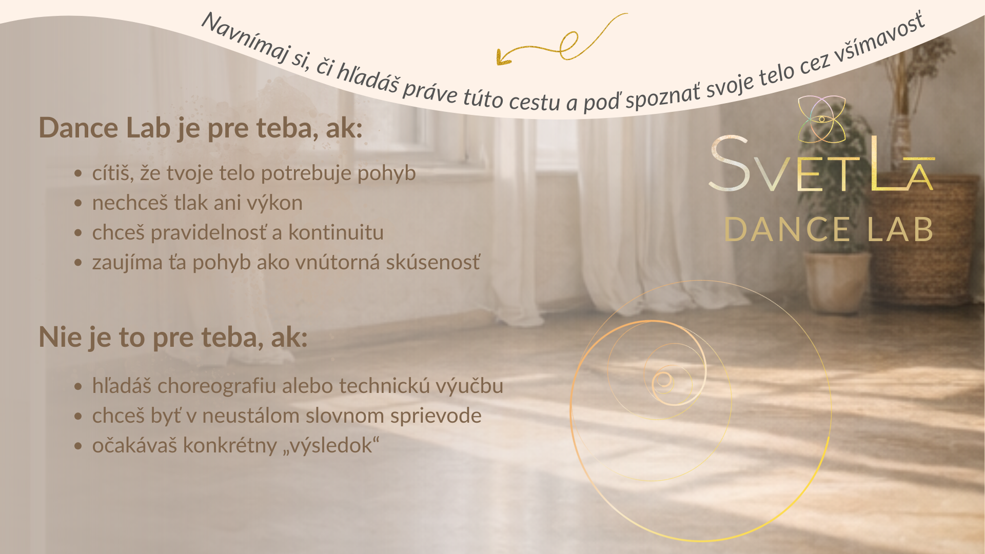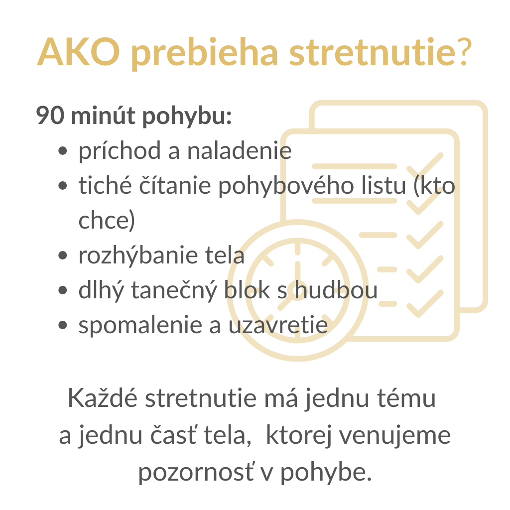 Kúpou tohto programu si rezervuješ miesto v tanečnej skupine. V prípade neúčasti na jednotlivých stretnutiach sa vstupné nevracia a nenahrádza . Aktuálne sa program otvára v meste Banská Bystrica a v Lučenci. Prebieha formou pravidelných stretnutí 1x do týždňa. Spoločne nás čaká 14 stretnutí . Banská Bystrica: začíname 17.3.2026 - 16.6.2026 NIYAMA YOGA STUDIO (Horná 14), každý utorok Lučenec: začíname 26.3.2026 - 25.6.2026 Veľká telocvičňa ZŠ M.R.Štefánika (Haličská cesta 8), každý štvrtok od 17:30 hod. PLATBA: Platbu môžete uhradiť v plnej výške alebo je možné rozdeliť ju na 2 časti. Zaplatíte zálohu v hodnote 100 € a zvyšnú sumu zaplatíte: do 4. týždňov od úvodnej dielne. Storno podmienky: 50% storno 3 dni pred začiatkom kurzu, v prípade náhradníčky 0% storno počas kurzu 100% storno ( závažné dôvody sú riešené individuálne) VIAC O PROGRAME TU !